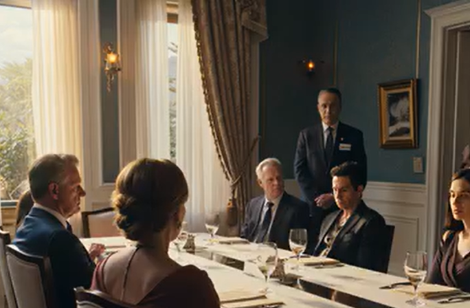 Stůl byl kulatý, prostřený pro dvanáct lidí, bílé prádlo tak čisté, že vypadalo vyžehlené do poslušnosti. Křišťálové sklenice. Stříbro vyleštěné až k bodu arogance. Vysoká aranžmá bílých orchidejí vystupujících ze středu jako koruna.